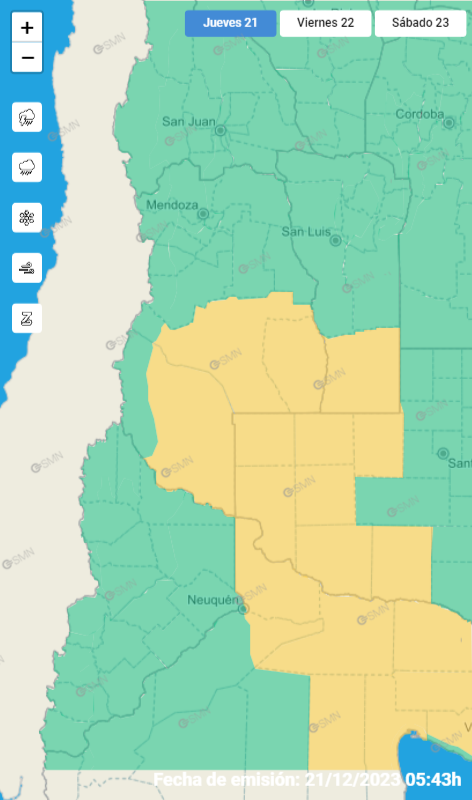 El Servicio Meteorológico Nacional (SMN) emitió este jueves una alerta amarilla por tormentas y viento Zonda para diferentes sectores de Mendoza.