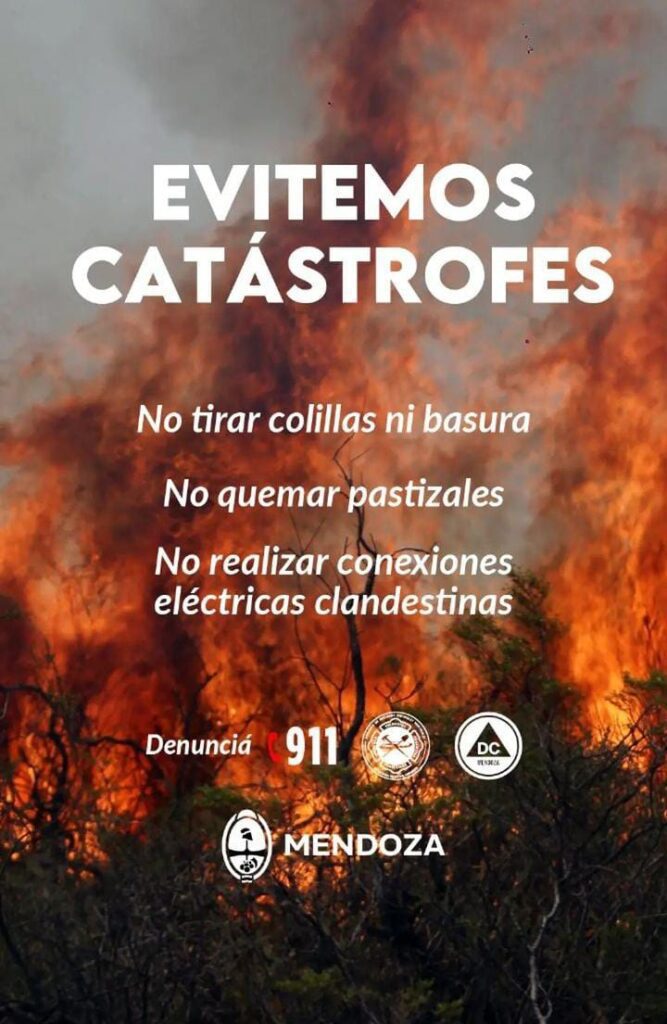 A fines de octubre, el devastador viento expandió las llamas de diferentes focos de incendios, causando grandes pérdidas materiales, de flora y fauna tanto en Las Heras como en Luján. Por este motivo, desde Defensa Civil solicitaron no tirar colillas de cigarrillos, no quemar pastizales y no realizar conexiones eléctricas clandestinas porque “la situación es crítica y la vegetación de Mendoza arde con facilidad”.