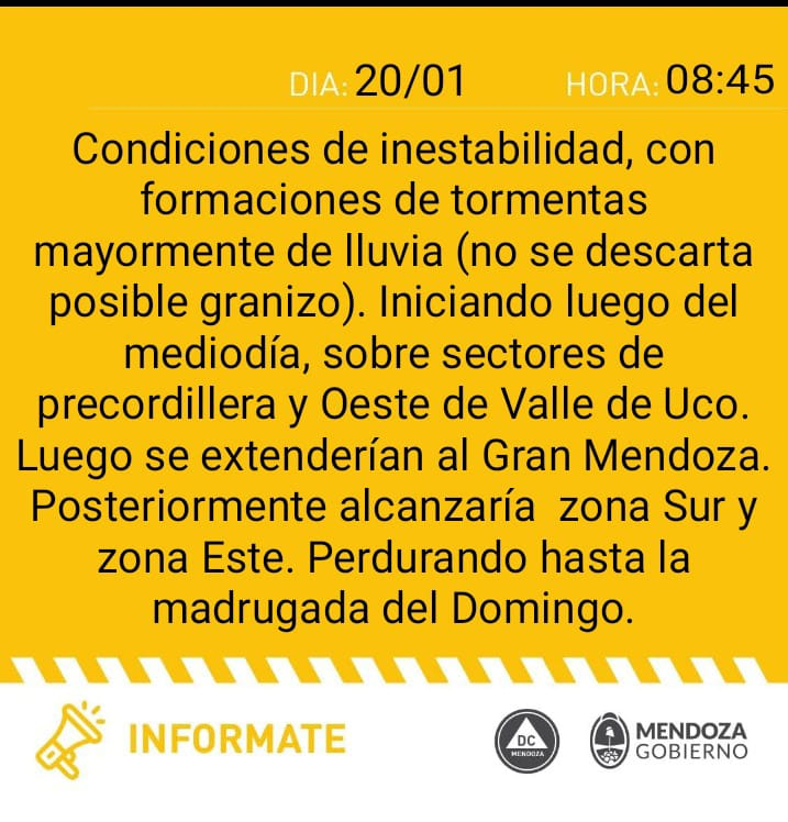 Señalaron que el evento meteorológico comenzaría luego del mediodía «sobre sectores de precordillera y oeste del Valle de Uco».