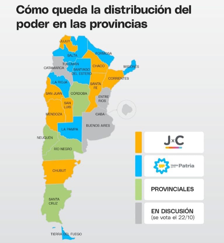 Entonces si vemos el mapa, y con las elecciones pendientes en dos provincias y en CABA para el 22 de octubre, en consonancia con las generales nacionales, la coalición opositora al gobierno de Alberto Fernández quedó con 9 amarillos sobre los 8 del oficialismo, que en poco menos de un mes arriesga los gobiernos de la provincia de Buenos Aires y Entre Ríos, descontando a Catamarca, donde se espera una victoria de Rubén Jalil.