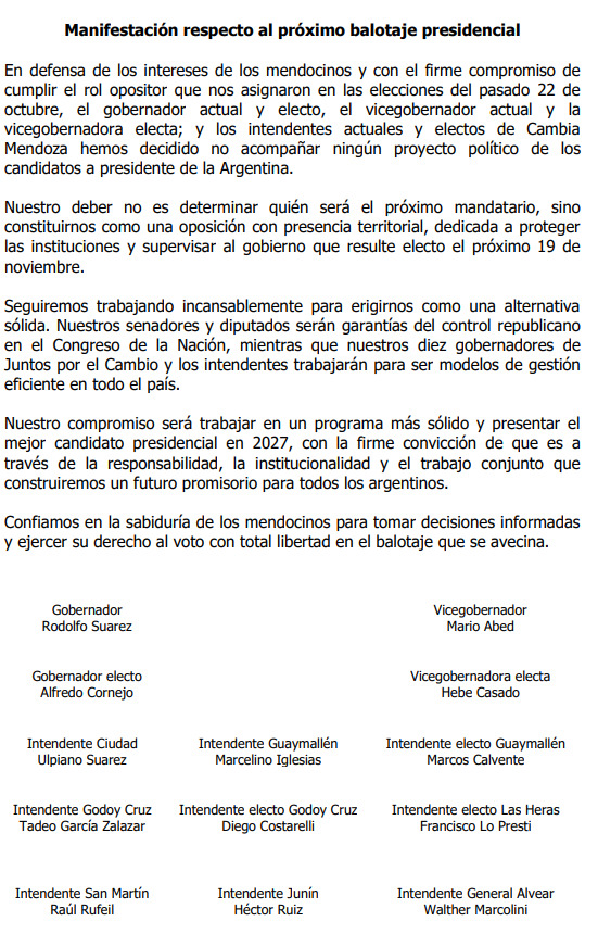 Los líderes de Cambia Mendoza que desempeñan o asumirán funciones en el ámbito institucional, tanto a nivel provincial como en los municipios de Mendoza, han manifestado abiertamente su postura con respecto al balotaje. Han dejado claro que no respaldarán ni a Sergio Massa ni a Javier Milei.