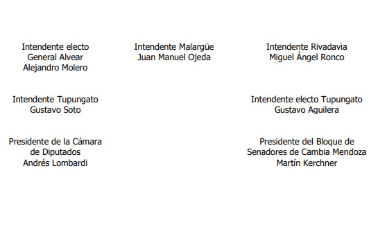 Lo firman Rodolfo Suarez y Mario Abed, gobernador y vice en funciones; Alfredo Cornejo y Hebe Casado, gobernador y vice electos; Andrés Lombardi, presidente de la Cámara de Diputados; los intendentes en funciones y electos Marcelino Iglesias, Marcos Calvente, Tadeo García Zalazar, Diego Costarelli, Ulpiano Suarez, Héctor Ruiz, Raúl Rufeil y Francisco Lo Presti, Walther Marcolini, Alejandro Molero, Gustavo Soto, Gustavo Aguilera, Juan Manuel Ojeda, Miguel Ángel Ronco y el presidente del bloque de senadores Martín Kerchner.