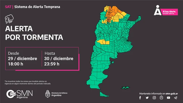 Indicaron que rige un alerta amarillo por tormentas para norte de Chaco, centro y norte de Formosa, todo Jujuy menos la cordillera, todo Salta menos la cordillera, el noroeste de Tucumán, sur de San Luis y sureste de Mendoza.