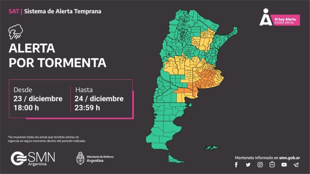 Desde el organismo indicaron que los fenómenos climáticos mencionados, sumado al granizo, podrían afectar a varios departamentos durante los festejos.