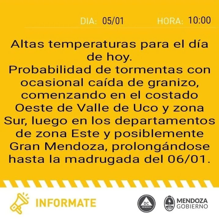 “Probabilidad de tormentas con ocasional caída de granizo, comenzando por el Oeste de Valle de Uco y Zona Sur”, indica el comunicado.