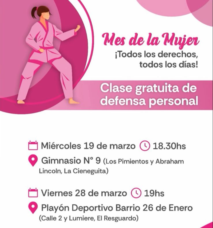 Defensa personal Las Heras: En el marco del Mes de la Mujer, la Municipalidad de Las Heras lanza una iniciativa imperdible: clases gratuitas de defensa personal para todas las mujeres de la comunidad. Estas jornadas buscan empoderar a las participantes, brindándoles herramientas prácticas para enfrentar situaciones de riesgo. Las clases se realizarán en dos fechas clave: 19 y 28 de marzo, en distintos puntos de la ciudad. ¡No te lo pierdas!