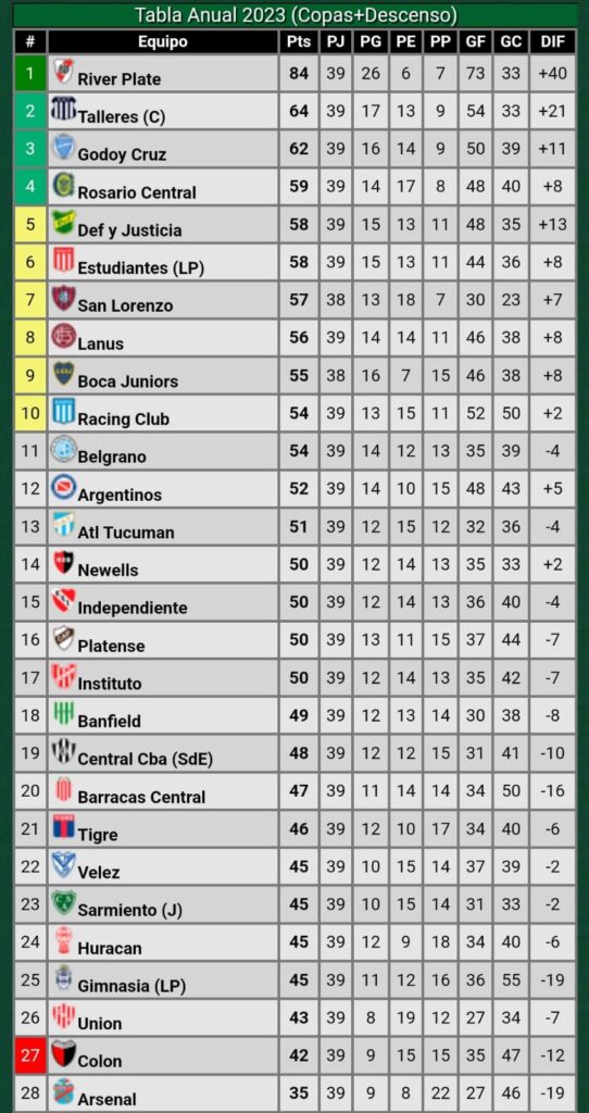 Aunque todavía le queda una opción, igual de complicada que la Copa de la Liga, que es clasificar por la Tabla Anual. Se encuentra actualmente en zona de clasificación a la Copa Sudamericana, en la novena ubicación con 55 unidades, a cuatro de entrar a la zona de Copa Libertadores. Como dijimos anteriormente Boca deberá ganar todos sus partidos que le quedan y además esperar resultados para conseguir la clasificación por este medio.