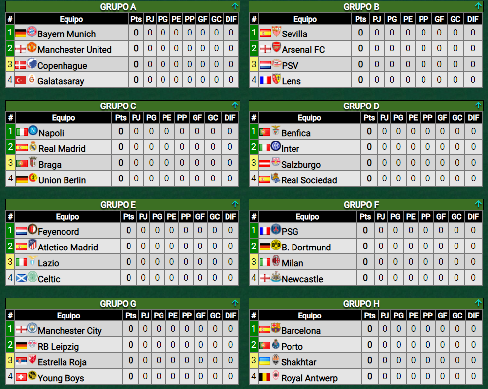 Bombo 1: Manchester City, Sevilla, Bayern de Múnich, PSG, Barcelona, Benfica, Nápoles y Feyenoord.