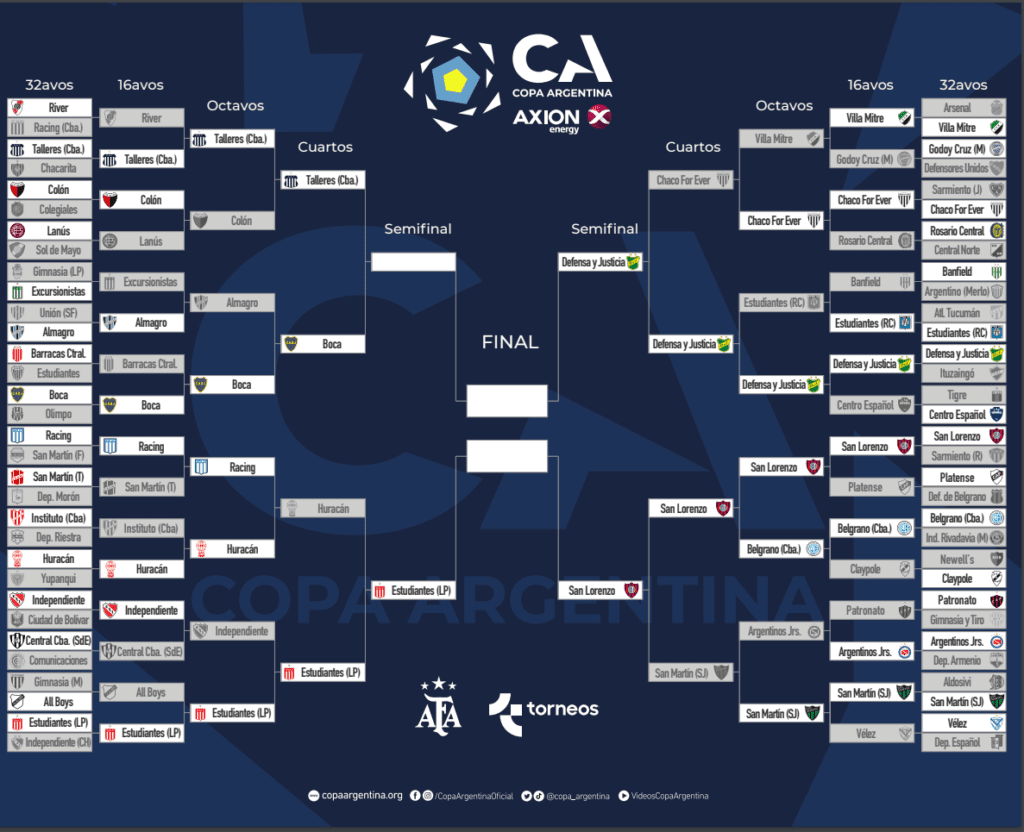 En la última semana, el torneo nacional ya ha determinado a tres de sus cuatro semifinalistas: San Lorenzo, que venció 1 a 0 a San Martín de San Juan; Defensa y Justicia, que superó a Chaco For Ever en penales después de un empate 1 a 1; y Estudiantes de La Plata, que ganó 2 a 0 a Huracán. La primera semifinal enfrentará a Cuervo y Halcón de Florencio Varela, mientras que la otra será entre Pincha y el ganador del enfrentamiento entre el xeneize y la T.