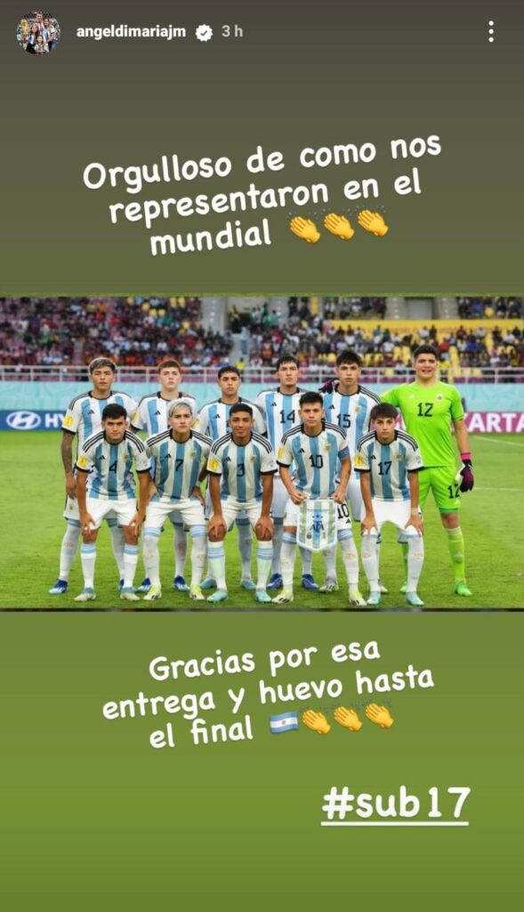 Pero no fue el único miembro de la Scaloneta que brindó su apoyo a «Los Pibes», Angel Di María en la misma plataforma publicó una historia.«Orgulloso de como nos representaron en el mundial» expresó el jugador del Benfica.