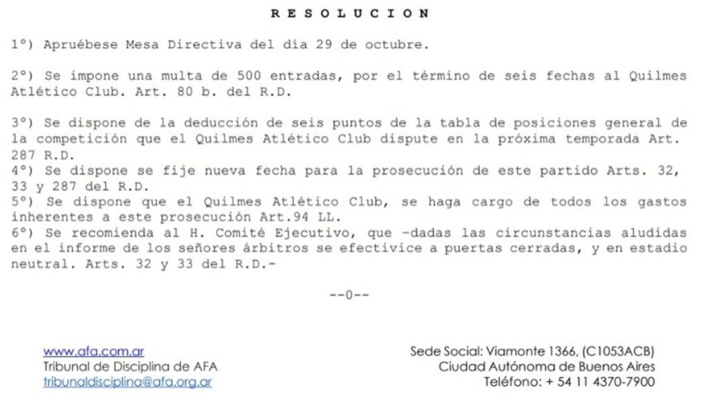 Además, Quilmes recibirá multas como la de asumir todos los gastos correspondientes a la organización, incluída toda la logística del club Gimnasia y Esgrima. También una multa equivalente al valor de 500 entradas durante seis fechas. No perderá la ventaja deportiva que tiene a favor, pero si se le restarán seis puntos de la tabla de posiciones de la temporada siguiente, es decir comenzará en la tabla con -6 puntos.