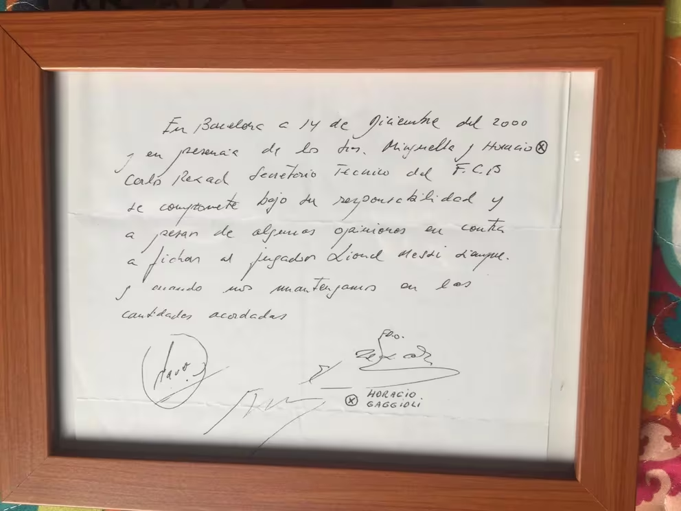 La servilleta, testigo de ese encuentro casual entre Rexach, Josep María Minguella y Horacio Gaggioli, representantes de Messi en ese momento, se ha convertido en un ícono del inicio de la legendaria carrera del astro del fútbol.