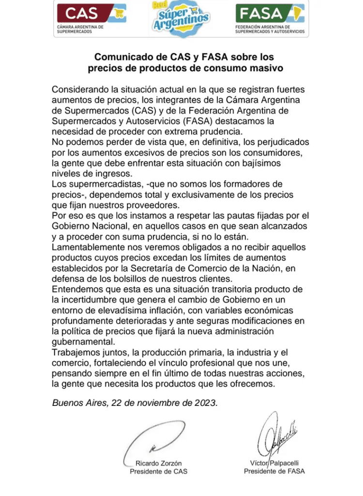 En el comunicado, los representantes de la CAS y la Federación Argentina de Supermercados y Autoservicios (FASA) enfatizaron la necesidad de proceder con «extrema prudencia» y solicitaron respetar las pautas establecidas por el Gobierno Nacional. Además, hicieron un llamado a la cautela en los casos en que dichas pautas no sean alcanzadas.