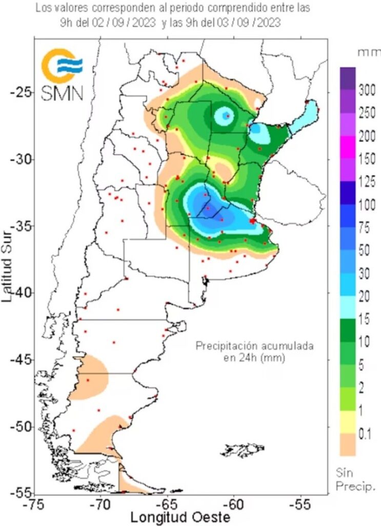 Registro de precipitaciones acumuladas entre el sábado y el domingo por la mañana. (SMN)