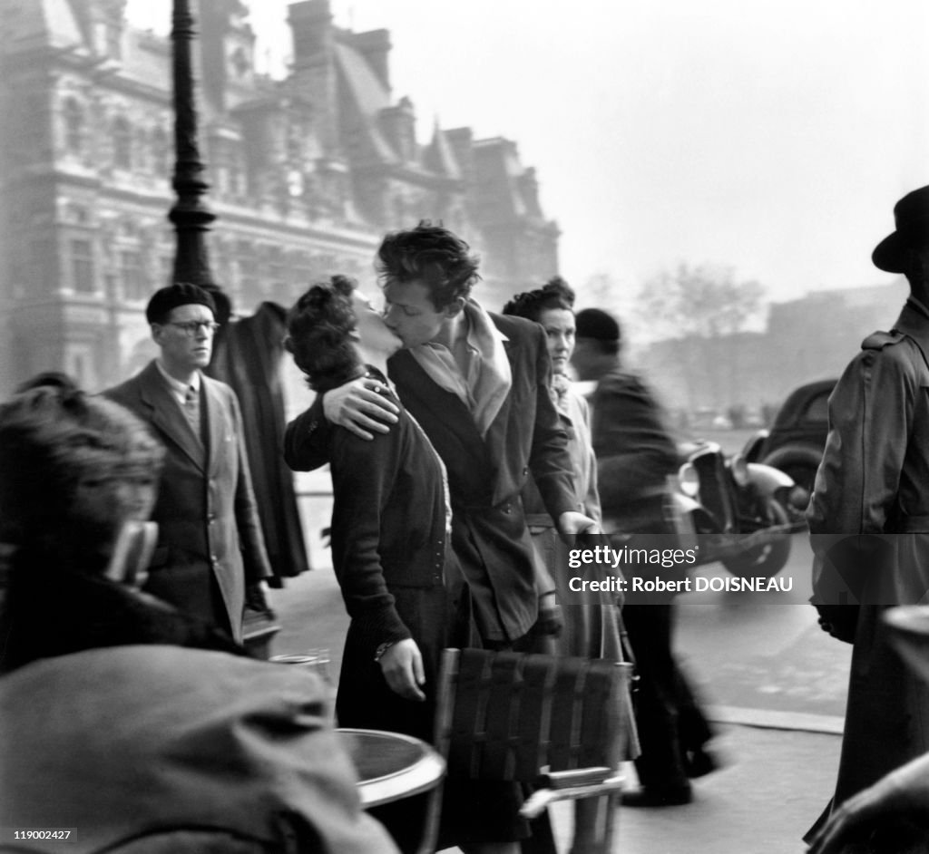Robert Doisneau capturó a una pareja besándose frente al ayuntamiento de París. Aunque posada, la imagen se convirtió en un símbolo del romanticismo parisino y la posguerra.