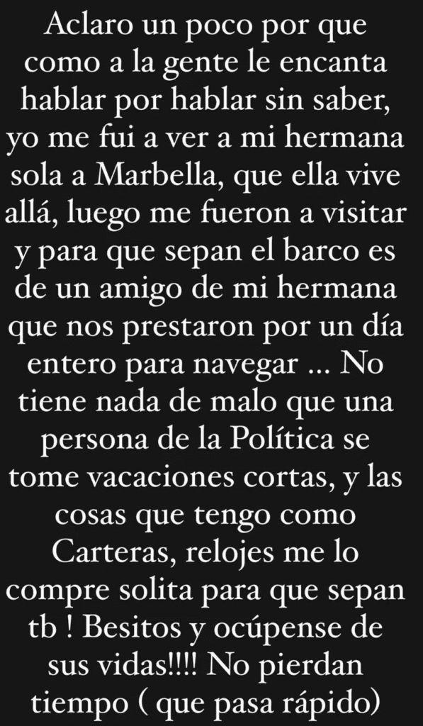 «No tiene nada de malo que una persona de la política se tome vacaciones cortas… Y las cosas que tengo como carteras, relojes, me las compré solita para que sepan. Besitos y ocúpense de sus vidas!!! No pierdan tiempo (que pasa rápido)”, cerró.
