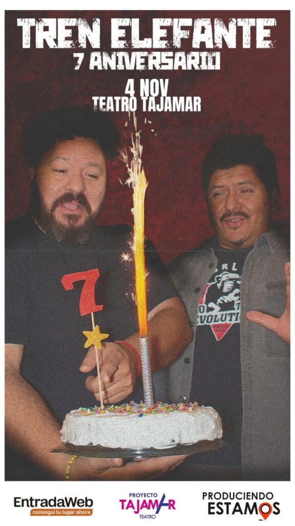 Tren Elefante una las bandas de mayor proyección de la escena del rock alternativo en Mendoza, integrada por Diego Jeréz, Nacho Jeréz y Pablo Olguín festeja 7 años en escena, en el Teatro Tajamar, el próximo sábado 4 de noviembre con una entrada general de $2000 y se puede conseguir en EntradaWeb.