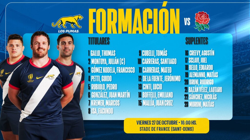 Confirmada la Formación Los Pumas vs Inglaterra, el seleccionado argentino de rugby, Los Pumas, se prepara para enfrentar a Inglaterra en el partido por el tercer puesto del Mundial de rugby Francia 2023. El encuentro se llevará a cabo el próximo viernes en el Stade de France a las 16:00 hora de Argentina. El coach Michael Cheika ha dado a conocer la formación titular para este partido crucial .