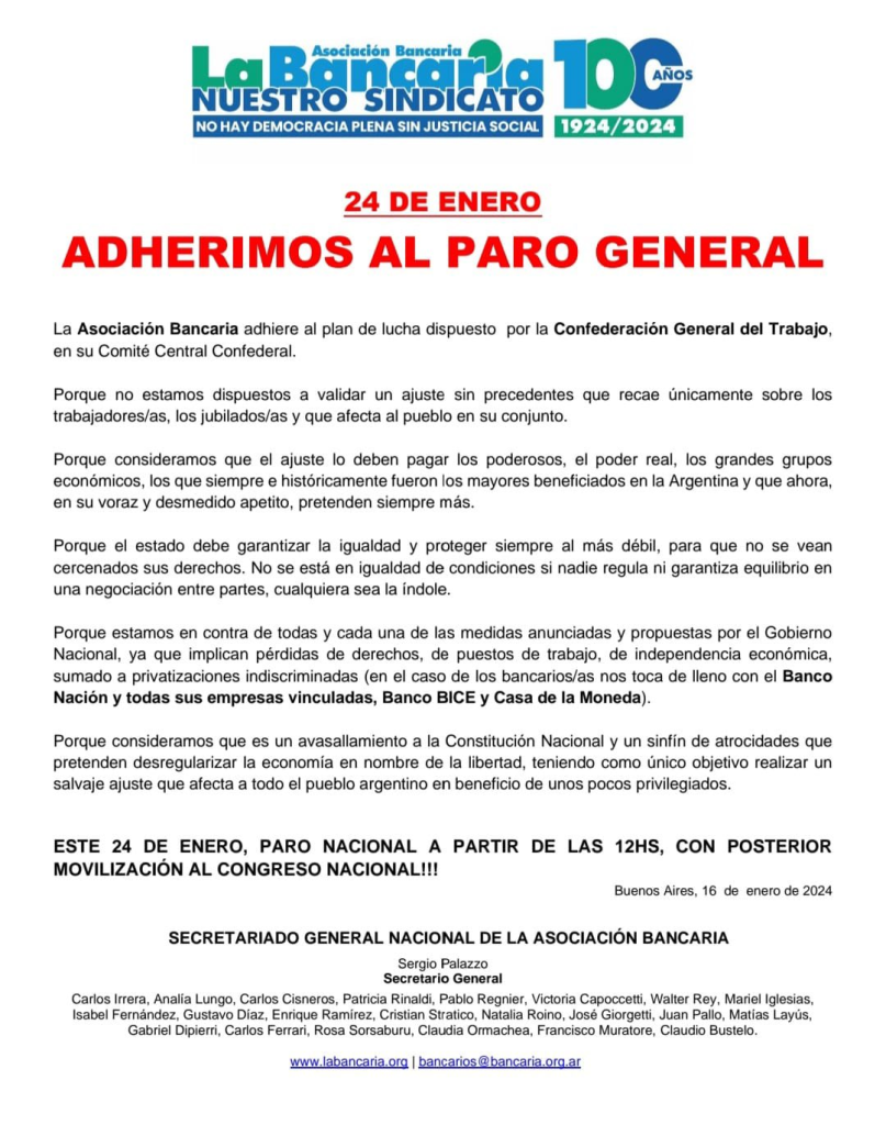 La Asociación Bancaria informó que se sumará al paro nacional a partir de las 12 horas del 24 de enero, con una posterior movilización hacia el Congreso de la Nación. La participación de los trabajadores bancarios promete afectar significativamente la actividad bancaria durante ese día.