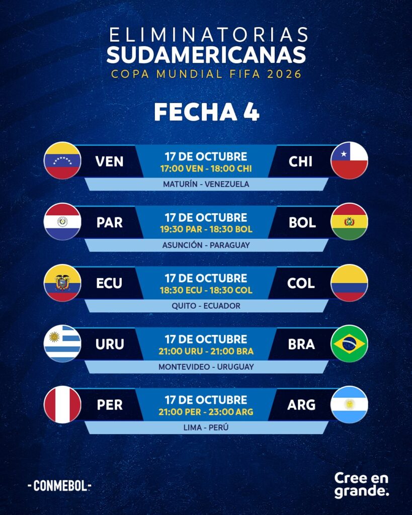 Partidos de hoy Eliminatorias Sudamericanas, Fecha 4: Fixture y Horarios de Todos los encuentros