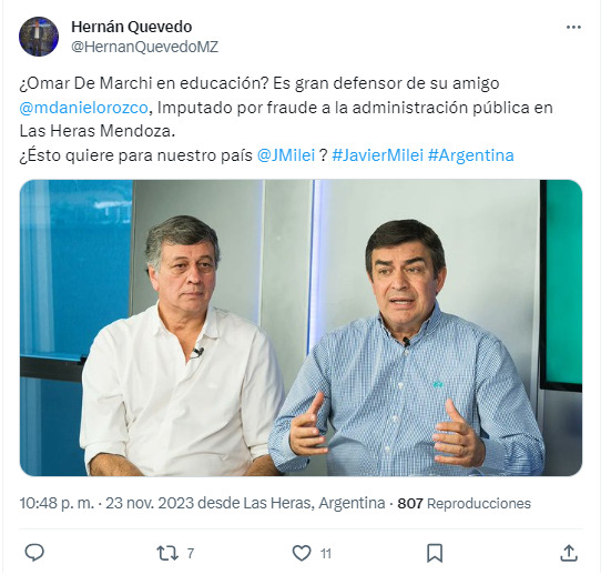 Hernan Quevedo, concejal del cornejismo en Las Heras, utilizó sus redes sociales para cuestionar la idoneidad de De Marchi para el área de educación, señalando la imputación por fraude a la administración pública de uno de sus allegados.