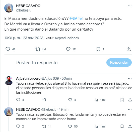 La vicegobernadora electa, Hebe Casado, fue una de las figuras políticas que manifestó su descontento públicamente a través de sus redes sociales, cuestionando la elección y haciendo referencia irónicamente al «Massa mendocino a Educación», en alusión a la comparación de De Marchi con el político nacional Sergio Massa.