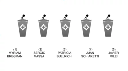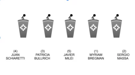 El domingo 1 de octubre, en el Centro de Convenciones Provincial Forum, en la ciudad capital de Santiago del Estero, el primero en ingresar al escenario será Milei, seguido por Schiaretti, Bullrich, Massa y Bregman. El orden en los atriles será el siguiente: