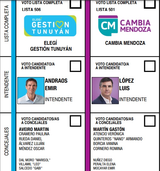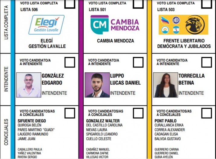 - Los candidatos a intendente en Lavalle son Edgardo González (frente Elegí), Lucas Luppo (Cambia Mendoza) y Betina Torrecilla (Libertarios).