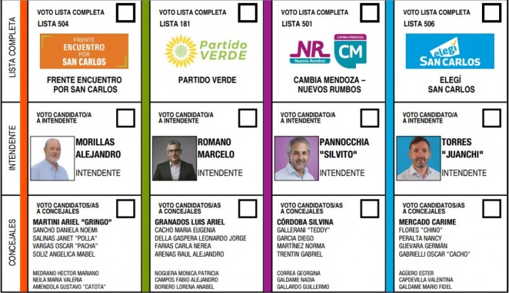 - San Carlos parece ser la única comuna con un resultado abierto, ya que en las PASO ganó Alejandro Morillas, pero Silvio Pannocchia (Cambia Mendoza) y Marcelo Romano (Partido Verde) lo superaron en votos.