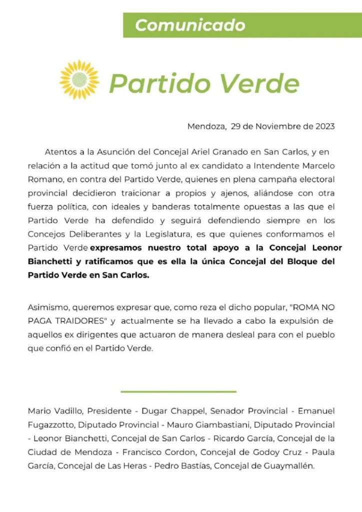 Fuerte ruptura política en el Partido Verde de Mendoza. El Partido Verde de Mendoza se encuentra inmerso en un tenso conflicto interno que ha llevado a una inminente expulsión de Marcelo Romano, exsenador provincial y candidato a intendente de San Carlos.