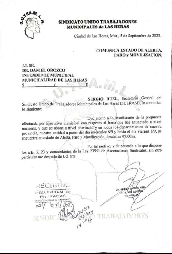 La relación entre el intendente Orozco y los trabajadores de Las Heras está deteriorada. Este martes 5 de septiembre, el sindicato emitió un nuevo comunicado donde oficializan el Estado de Alerta, Paro y Movilización. La carta ingresada en mesa de entradas del municipio pone en aviso a Orozco sobre la situación.