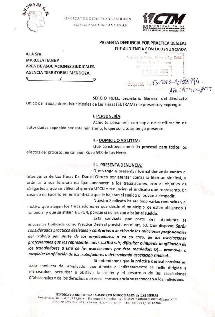 Según expresa el documento, el intendente Daniel Orozco habría atentado contra la libertad sindical “al ordenar a sus funcionarios que amenacen a los trabajadores, con el objetivo de obligarlos a que se afilien al gremio UPCN y renuncien al sindicato que represento. En caso de no hacerlo, se les manifiesta que le bajarán el sueldo o los van a despedir”.