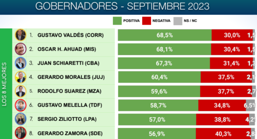 Solamente cuatro gobernadores superan el desempeño de Suárez. Estos son Gustavo Valdés (Corrientes) con un 68,5%, Oscar Ahuad (Misiones) con un 68,1%, Juan Schiaretti (Córdoba) con un 67,3% y Gerardo Morales (Jujuy) con un 60,4%.