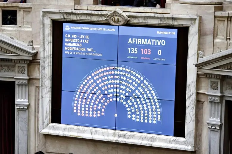Obtuvo 135 votos a favor, con apoyo de Javier Milei y la Izquierda, y 103 en contra. Cerca de las 21.40 se logró media sanción del proyecto de modificación del impuesto, con la presencia del impulsor de la medida, el ministro Sergio Massa.