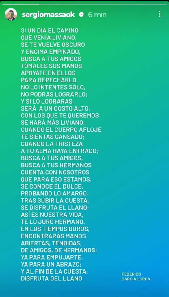 El poema compartido por Massa en su historia de Instagram, titulado «La cuesta de la vida», comenzaba con versos que exhortaban a buscar apoyo en los amigos en momentos de dificultad, llevando un mensaje de solidaridad y acompañamiento en momentos adversos.
