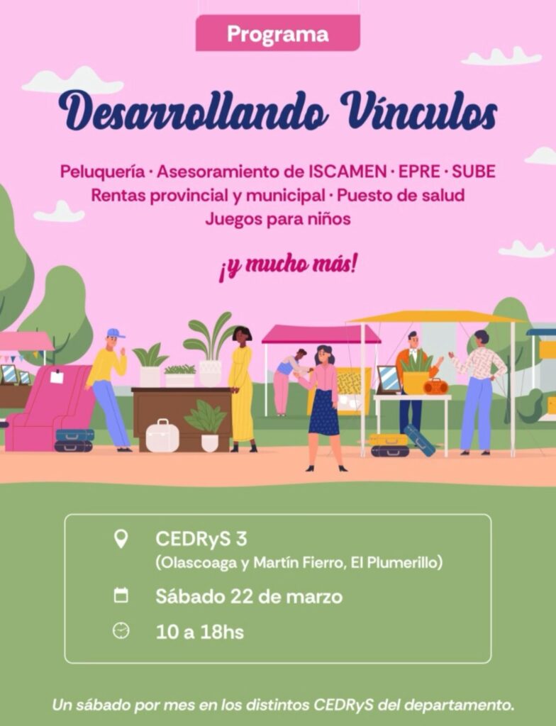 Servicios gratis en Cedrys 3: No dejes pasar la oportunidad de ser parte de esta gran jornada comunitaria. Acércate al CEDRyS 3 el sábado 22 de marzo, de 10 a 18 hs, y disfruta de todo lo que «Desarrollando Vínculos» tiene para ofrecerte. ¡Te esperamos!