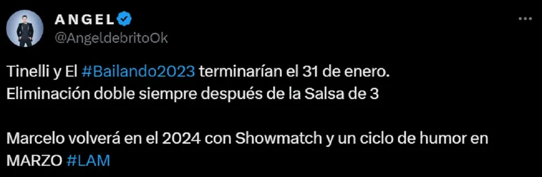 A través de su cuenta de X (ex Twitter), De Brito compartió la noticia sobre el fin del Bailando 2023, indicando que este culminaría el 31 de enero, con una eliminación doble tras la salsa de tres, ratificando detalles previamente mencionados durante el certamen.