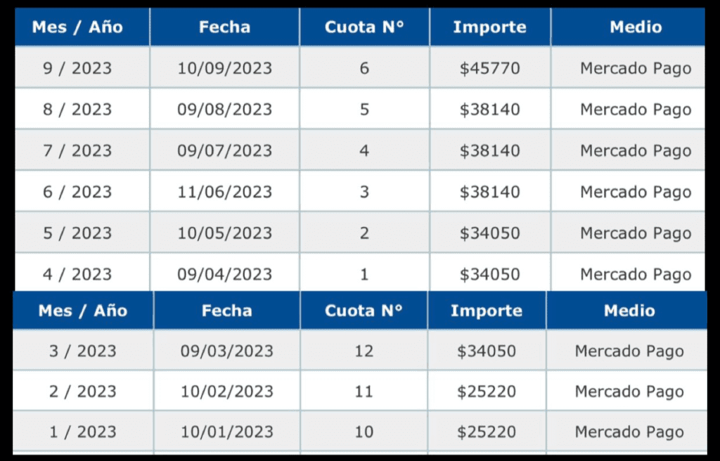 Los aumentos escalonados se pueden ver reflejados en la siguiente imagen, donde se muestra como desde enero a septiembre, específicamente en la carrera de psicología, la cuota pasó de valer $25.000 a salir $45.770.