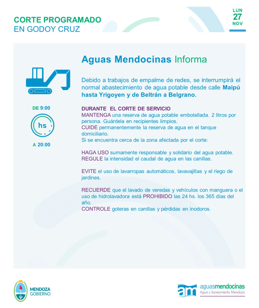 Aguas Mendocinas informó que el corte de agua y la interrupción del servicio será «debido a trabajos de empalme de redes».