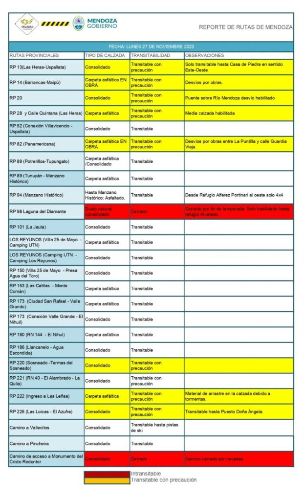 La Dirección de Vialidad Provincial informa el estado de las rutas de Mendoza para hoy lunes 27 de noviembre. En algunas rutas de la Provincia de Mendoza se encuentra reducida la circulación por obras y desvíos.
