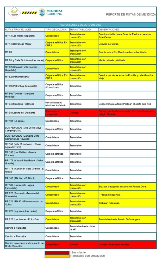 La Dirección de Vialidad provincial informa el estado de las rutas de Mendoza para hoy lunes 9 de octubre. En algunas rutas de la Provincia de Mendoza se encuentra reducida la circulación por obras y desvíos.