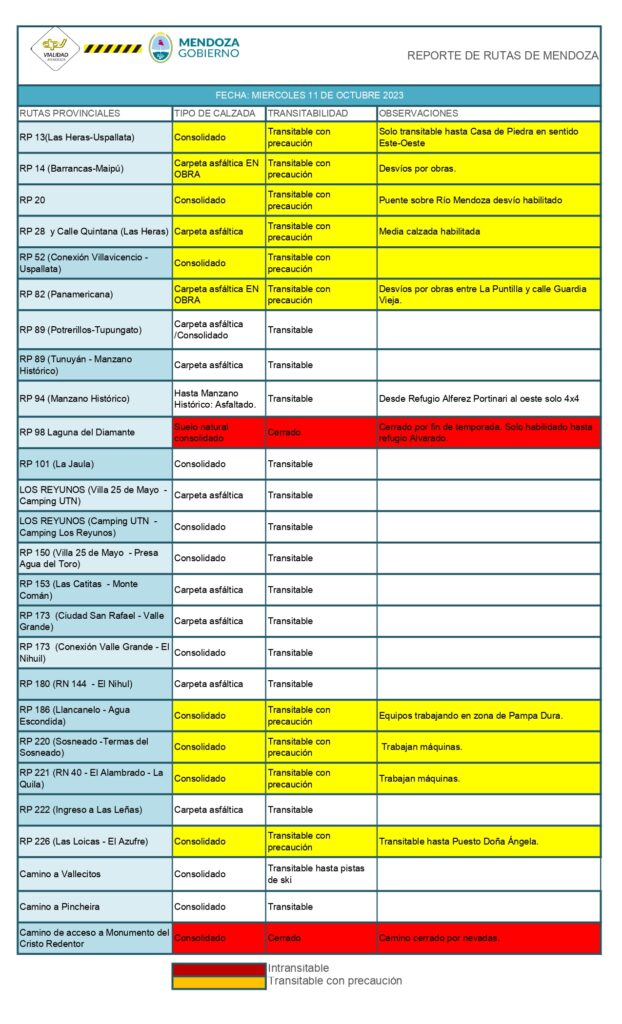 La Dirección de Vialidad provincial proporciona información actualizada sobre las condiciones de las rutas de Mendoza para este miércoles 11 de octubre.