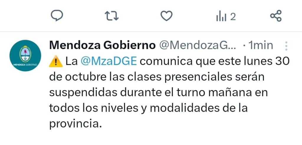 La Dirección General de Escuelas comunica que este lunes 30 de octubre las clases presenciales serán suspendidas durante el turno mañana en todos los niveles y modalidades de la provincia.