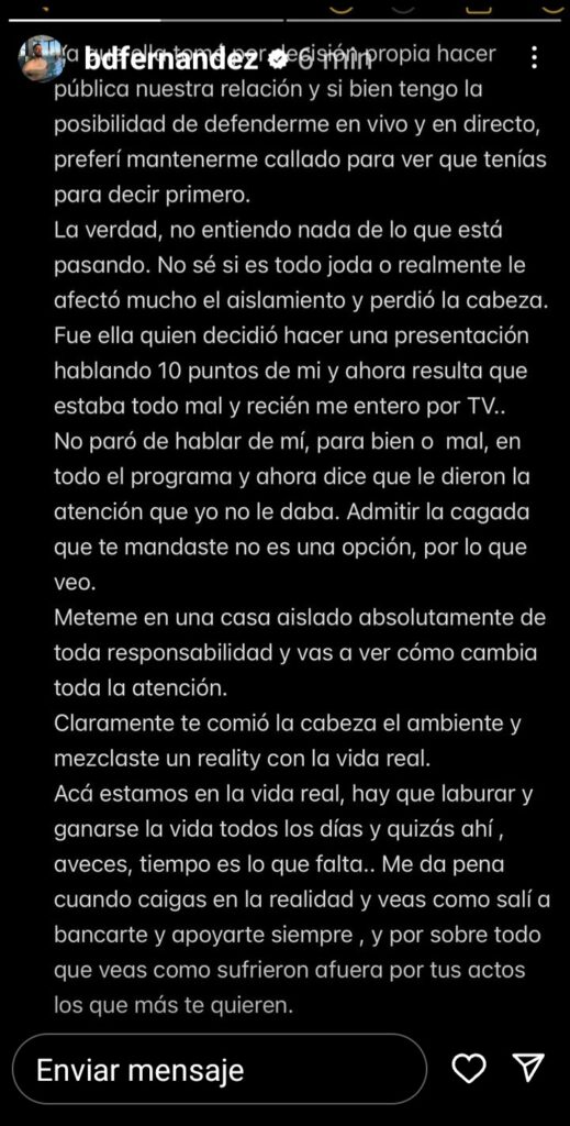 Se cansó del silencio o mejor dicho que lo «boludeen» y publicó una descarga a través de instagram.