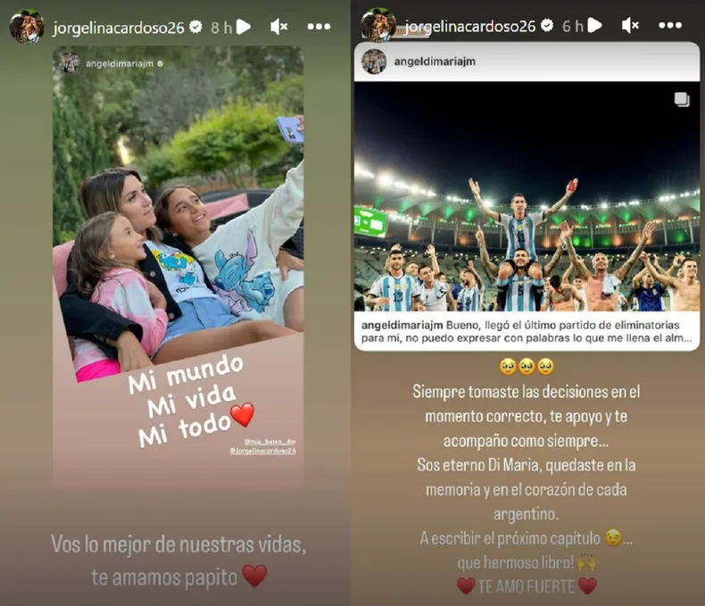 Jorgelina Cardoso compartió en su cuenta de Instagram una historia publicada por Ángel Di María, donde este expresaba: «Mi mundo, mi vida, mi todo». Conmovida, Jorgelina decidió repostear la historia agregando: «Vos lo mejor de nuestras vidas, te amamos papito». Un gesto que refleja la complicidad y amor entre la pareja.