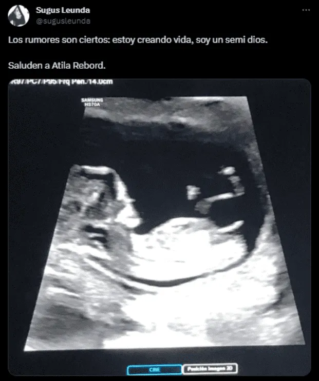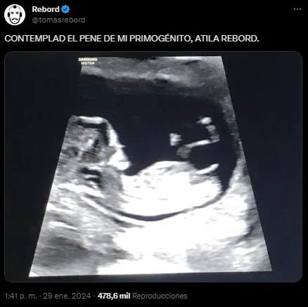 El anuncio llegó a través de Twitter, donde Rebord compartió emocionado: «Contemplad el pene de mi primogénito, Atila Rebord». Su pareja, Agustina «Sugus» Leunda, también se sumó a la alegría con su mensaje: «Los rumores son ciertos: estoy creando vida, soy un semi dios. Saluden a Atila Rebord». Ambos mensajes estuvieron acompañados por la imagen de una ecografía.