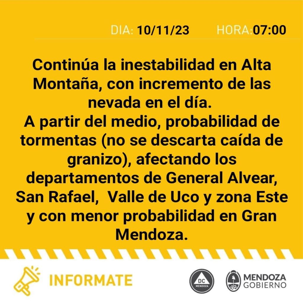 Este viernes, la provincia de Mendoza se prepara para enfrentar un día de condiciones climáticas adversas, según advierte el informe proporcionado por Contingencias Climáticas.