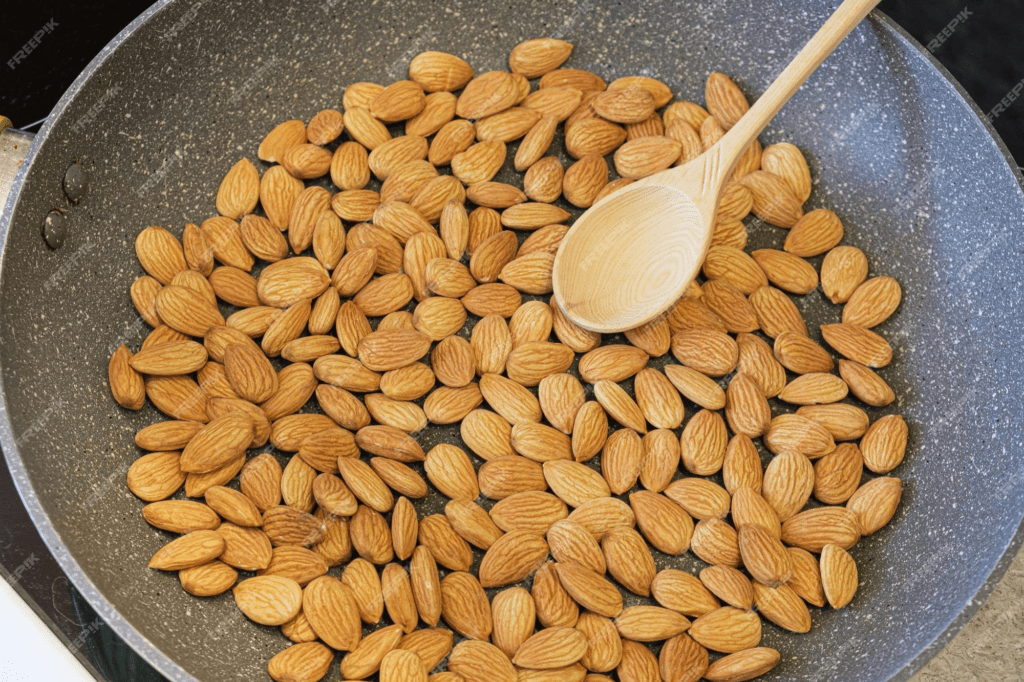 Comienza por tostar las almendras en una sartén a fuego medio hasta que adquieran un tono dorado. Esto resaltará su sabor y aroma. Una vez tostadas, déjalas enfriar y reserva algunas para decorar el turrón más adelante.