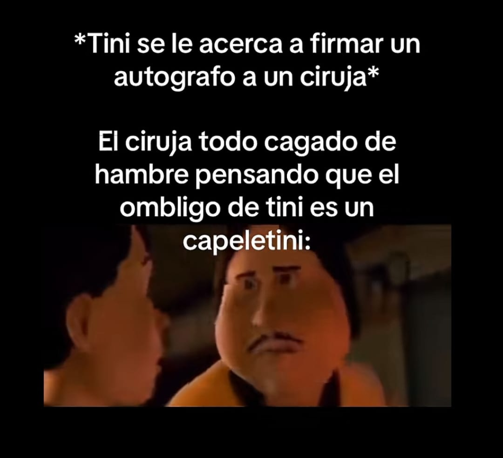 La creatividad no se detiene en las marcas comerciales. Otro de los memes del pupo de Tini que se ha vuelto un clásico moderno es el que involucra a un personaje «ciruja» o en situación de calle, quien en un delirio visual confunde el ombligo de la artista con un capeletini. Este tipo de humor, que roza lo bizarro, utiliza el juego de palabras entre el nombre de la pasta y el apodo de la cantante para crear una narrativa corta y desopilante. Lejos de buscar una ofensa real, estos memes funcionan como una hipérbole de la estética delgada y estilizada que Tini suele mostrar en sus producciones de fotos y conciertos.