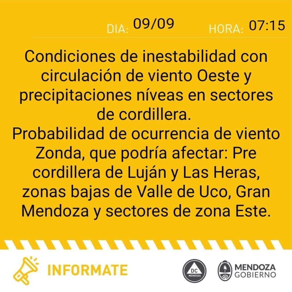 Desde la Dirección de Contingencias Climáticas de la provincia se ha emitido una alerta debido a la probabilidad de viento Zonda en horas de la tarde y una marcada inestabilidad en la zona de la Cordillera de los Andes. Según el comunicado oficial, se espera que el viento Zonda afecte a áreas de precordillera Norte (Uspallata, Potrerillos), precordillera del Valle de Uco, Gran Mendoza y General Alvear. Se prevé que este viento tenga una intensidad moderada, presente desde el mediodía hasta el anochecer.
